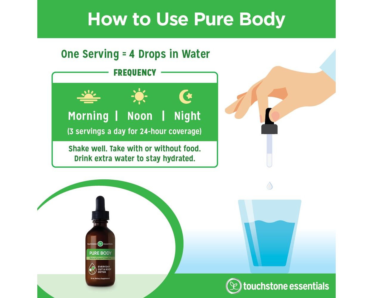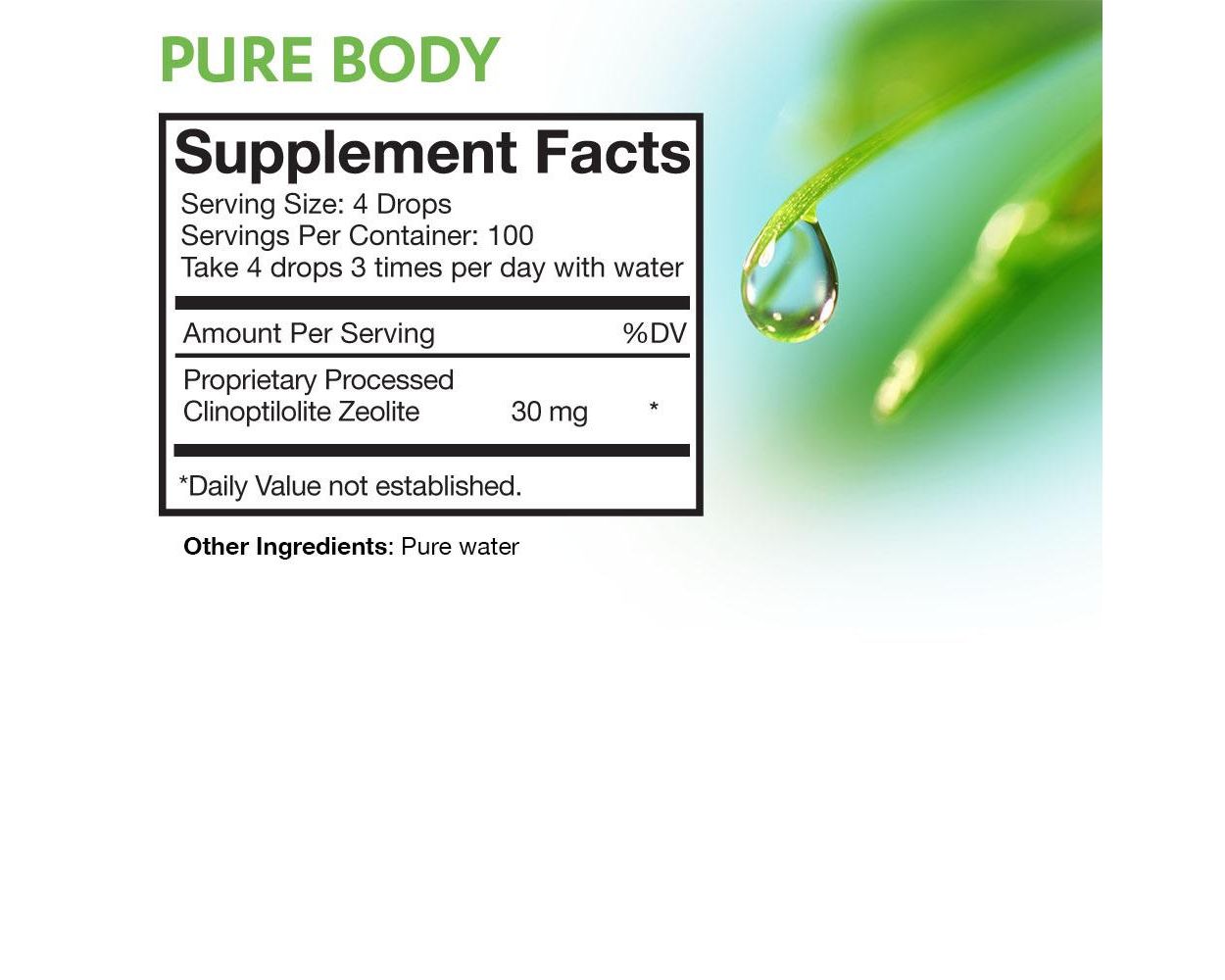 GENTLE AND EFFECTIVE DETOX: Pure Body uses purified zeolite sized for superior absorption and highly effective detoxification. BODY AND DIGESTIVE LIQUID ZEOLITE DETOX: Supports enhanced digestion and gently detoxes throughout the body by simply adding 4 drops, 3 times a day to water.